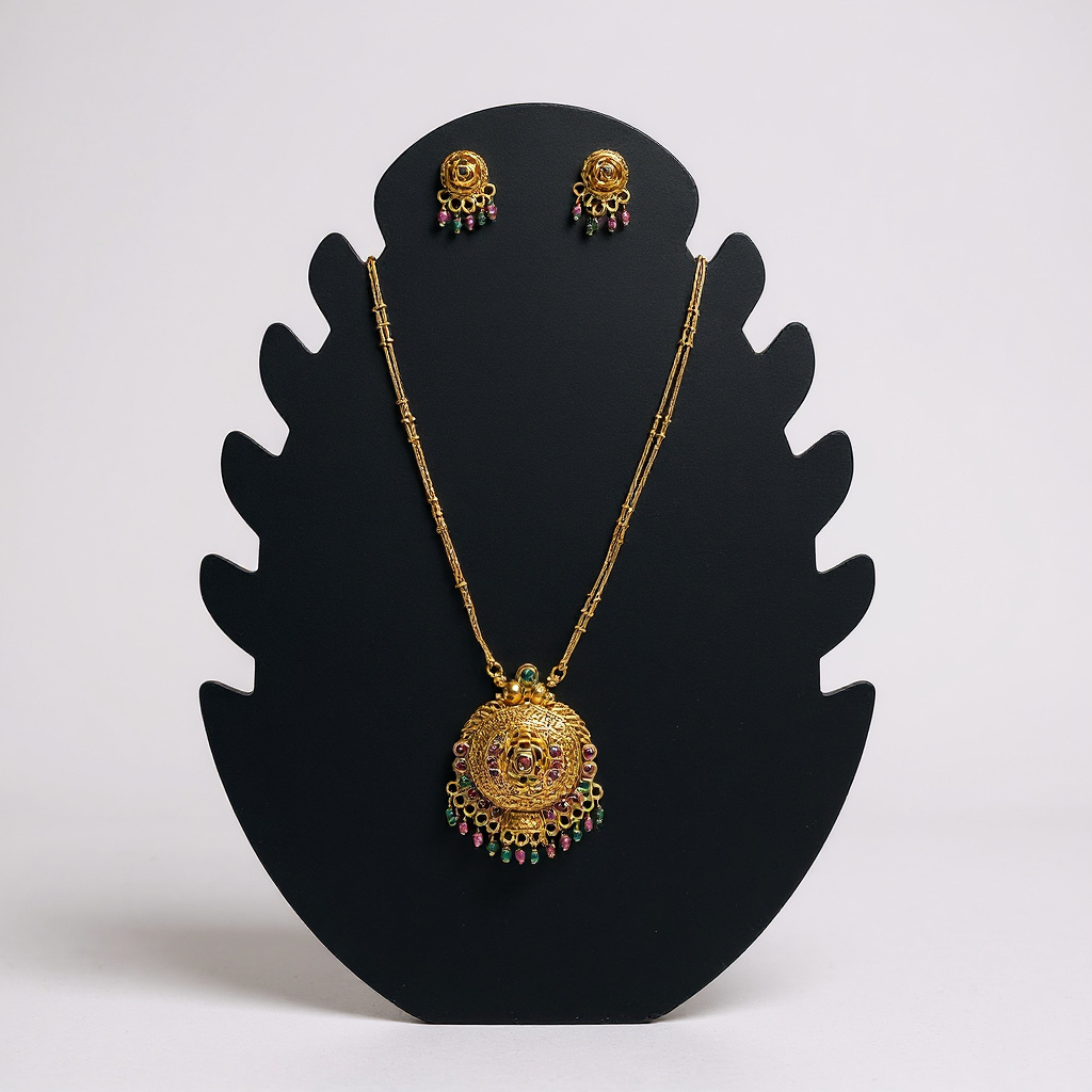 Vibrant and elegant, this multi-colour ruby stone mala features intricately crafted elements highlighted with a mix of ruby-toned stones for a rich, colourful appeal. Inspired by classic South Indian jewellery, the gold-tone finish and vivid stone accents make it perfect for weddings, festive occasions, and cultural celebrations. A striking statement piece that beautifully complements silk sarees and ethnic ensembles.