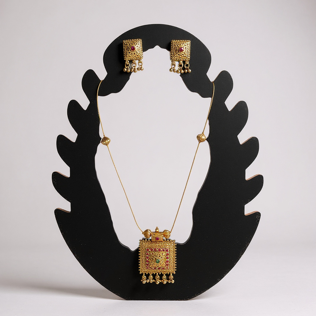 A classic long chain featuring a finely crafted square pendant, adding timeless elegance to traditional and festive looks.